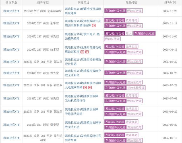 近些年凯迪拉克XT4的质量隐患频发,从车质网数据来看,凯迪拉克XT4的“燃油泵故障”已成“通病”,2018款至2023款车型相关投诉近500例,车主反馈车辆在行驶中突然出现发动机报警、动力输出异常等问题,经4S店检测确认系车燃油泵控制模块失效。