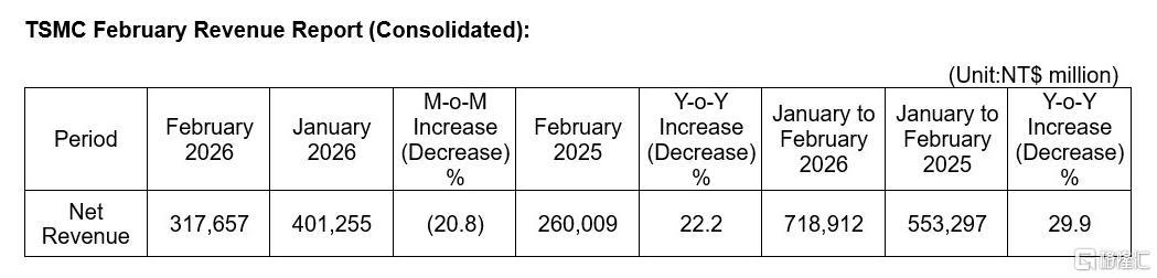 台积电官网公布数据显示,台积电2月销售额3176.6亿元台币,同比增长22.2%,创历年同期新高;受农历春节假期影响,2月环比下滑20.8%。
